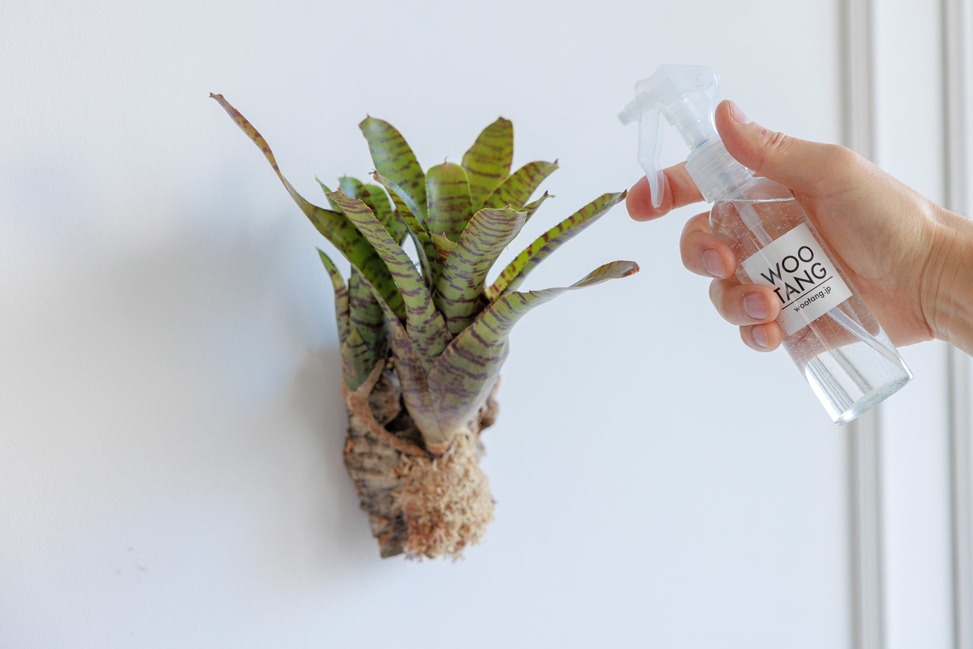 もし植物を大きく成長させたい場合は液体肥料をあげる必要があります。液体肥料は直接、器の中の水に入れると植物が根腐れして枯れることがあるので、必ず葉面散布してください。水で希釈した液体肥料をスプレーに入れて、月1〜2回程度、葉の面裏にかけてください。