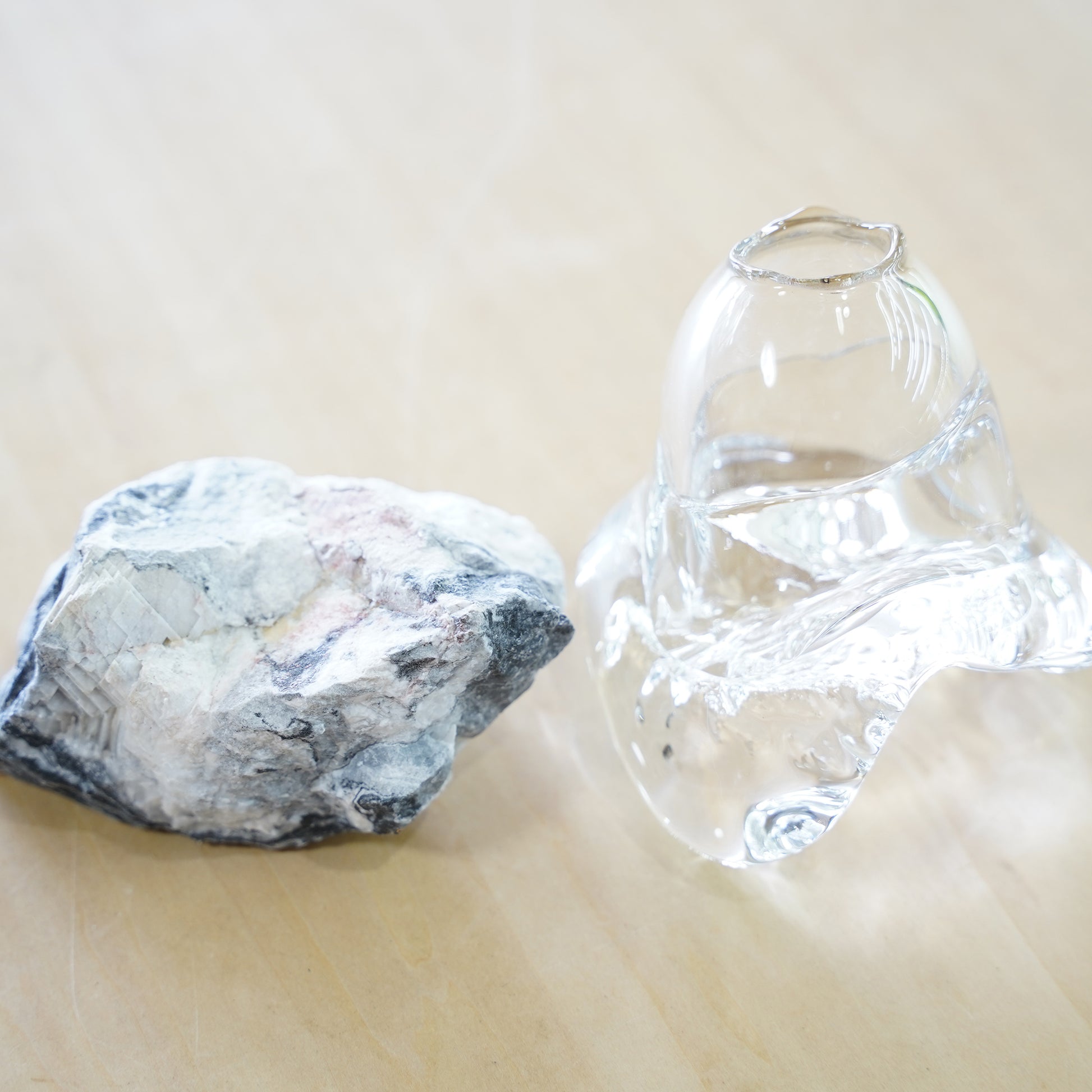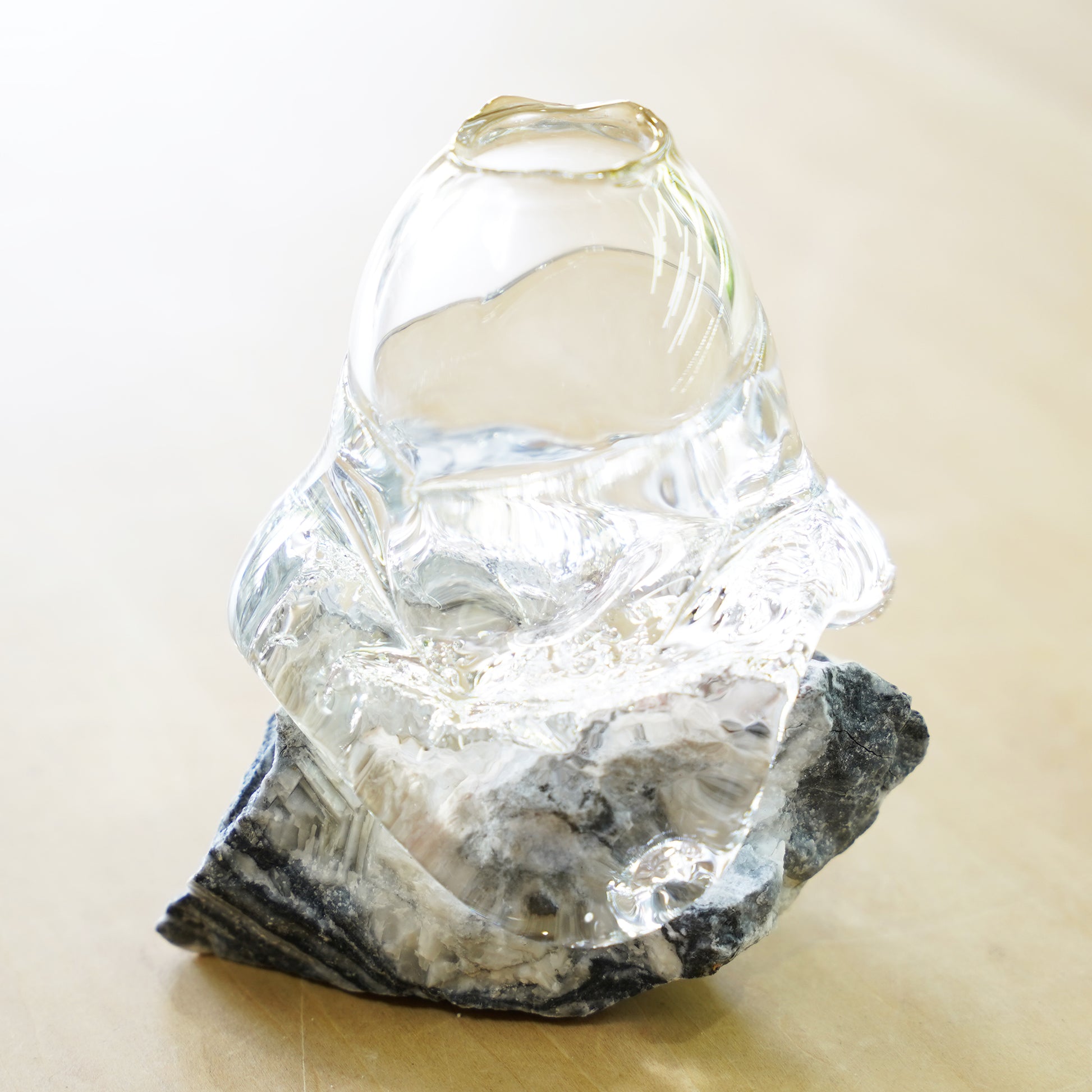 吹きガラスの手法で、石の上にガラスの器を密着させて制作したWOOTANGオリジナルの植物Vaseです。透明度の高いガラスが、石を包み込む「水の塊」のように見え、植物を飾ると石とガラスと植物が一体となり、唯一無二のアート作品のような佇まいに。観葉植物だけでなく、一輪挿しとしても、小さな枝ものを飾るのにも最適で、季節ごとに表情を変える自然の美しさを、より印象的に際立たせます。器と石は取り外し可能。