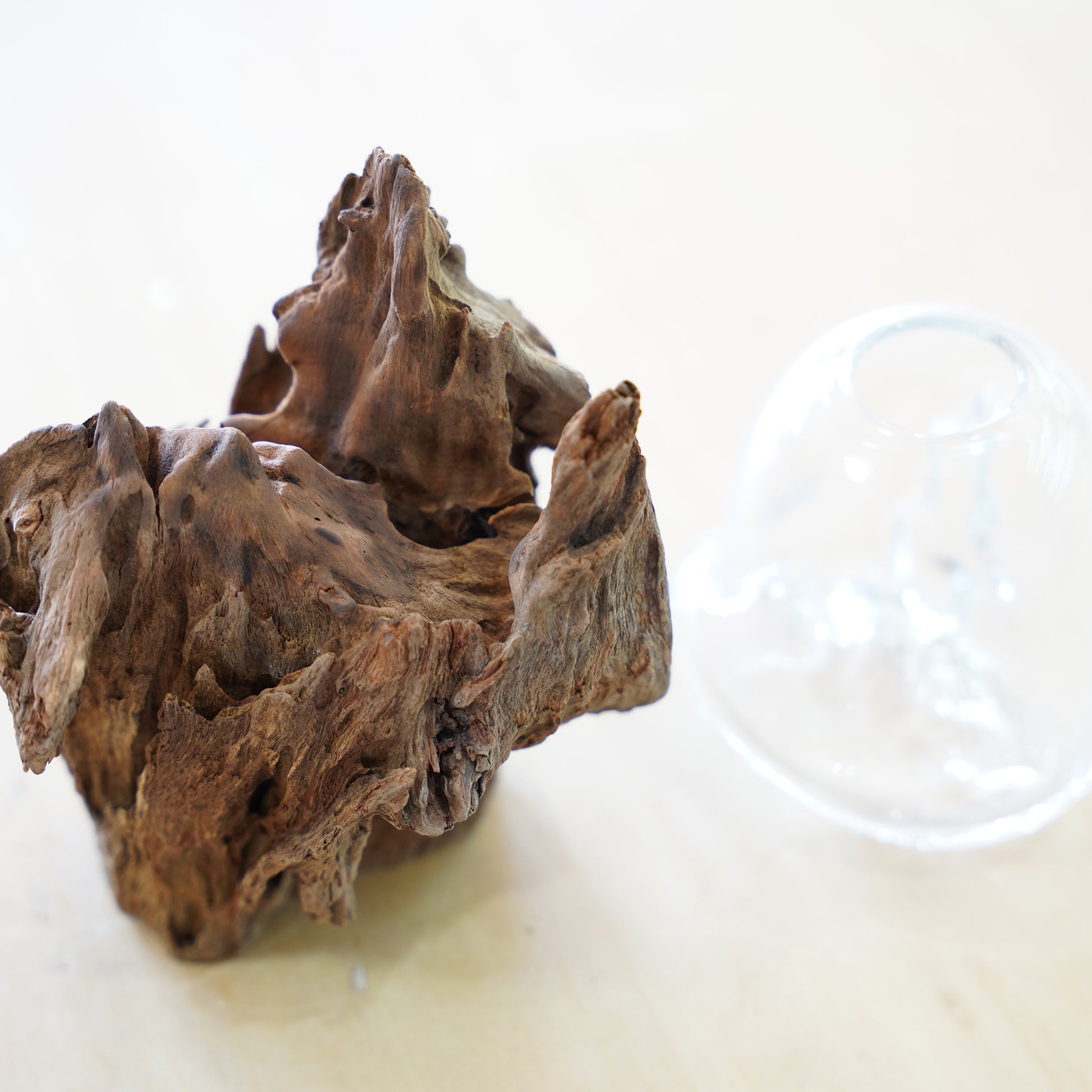 吹きガラスの手法で、流木の上にガラスの器を密着させて制作したWOOTANGオリジナルの植物Vaseです。透明度の高いガラスが、流木を包み込む「水の塊」のように見え、植物を飾ると流木とガラスと植物が一体となり、唯一無二のアート作品のような佇まいに。観葉植物だけでなく、一輪挿しとしても、小さな枝ものを飾るのにも最適で、季節ごとに表情を変える自然の美しさを、より印象的に際立たせます。器と石は取り外し可能。